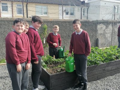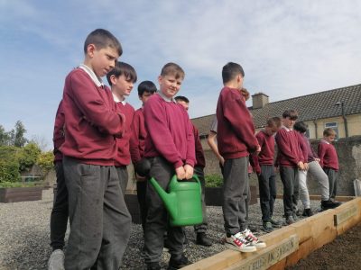 Recently, our school garden has been given a major sprucing up! We have completely redone the garden, located at the back of the senior yard, and the results are fantastic. Each class in the school has been planting in their own flower beds – we’ll soon have lots of different veggies and herbs to chose from! This week the boys from 5th planted some wildflowers at the entrance to the garden. Wildflowers will help to support our Biodiversity, by supporting pollinators like bees and butterflies, which will help provide food sources for other wildlife and people!